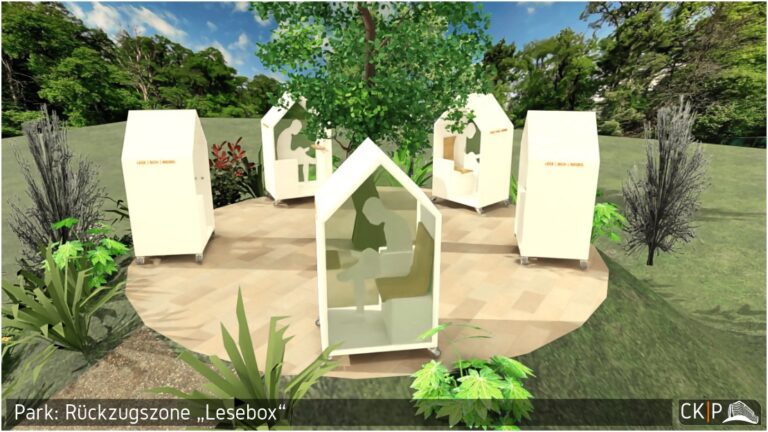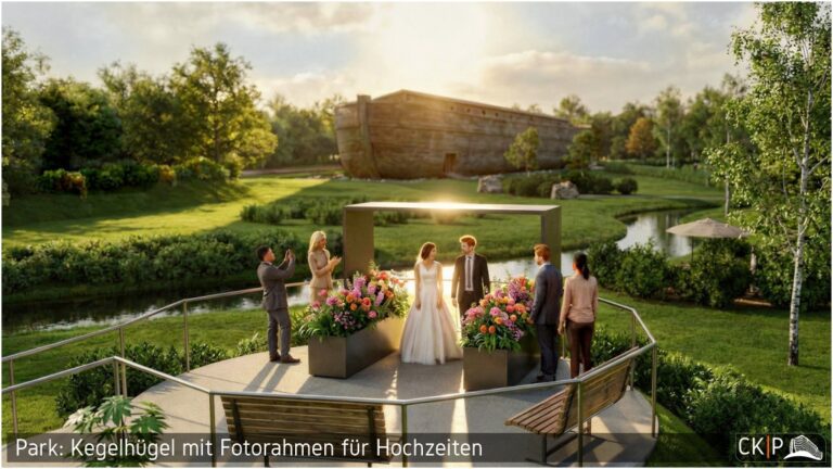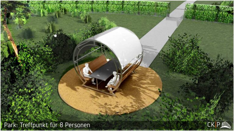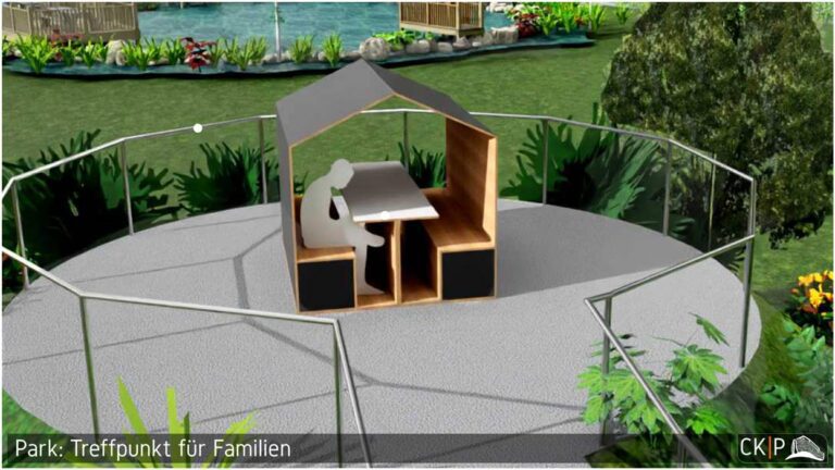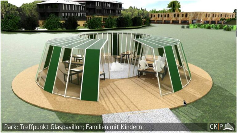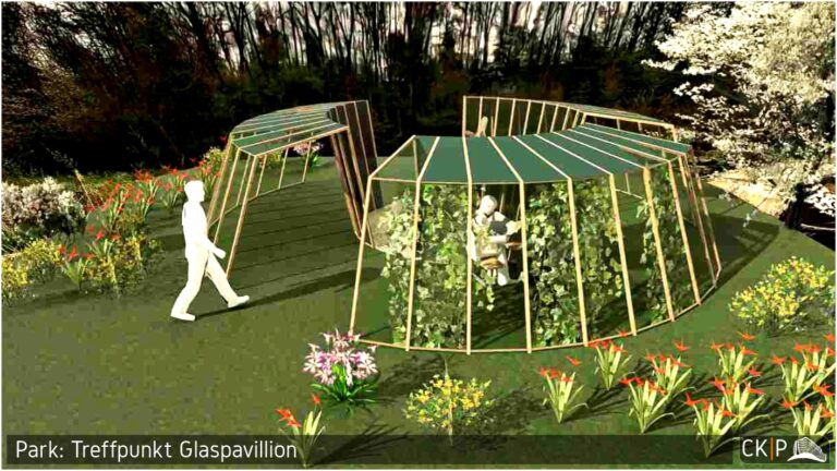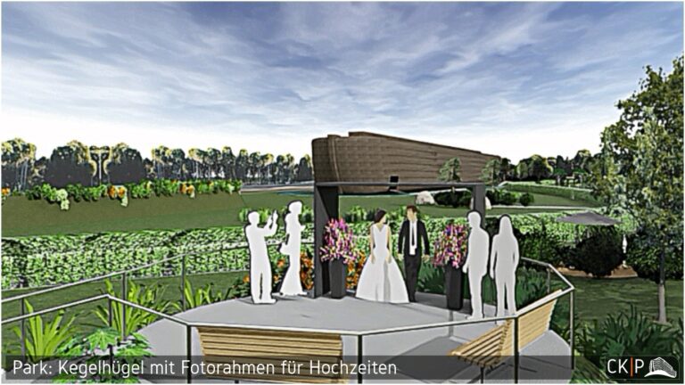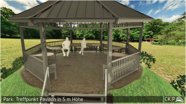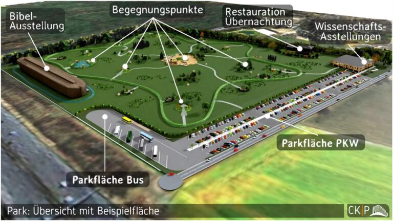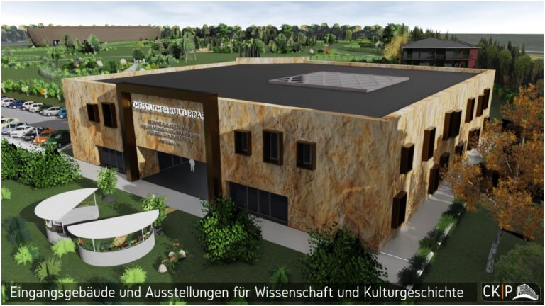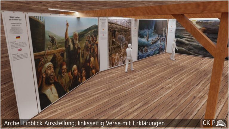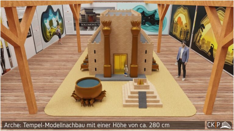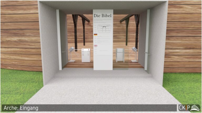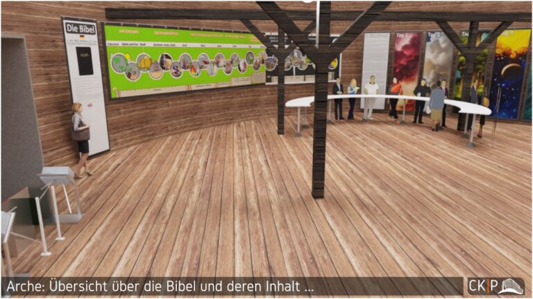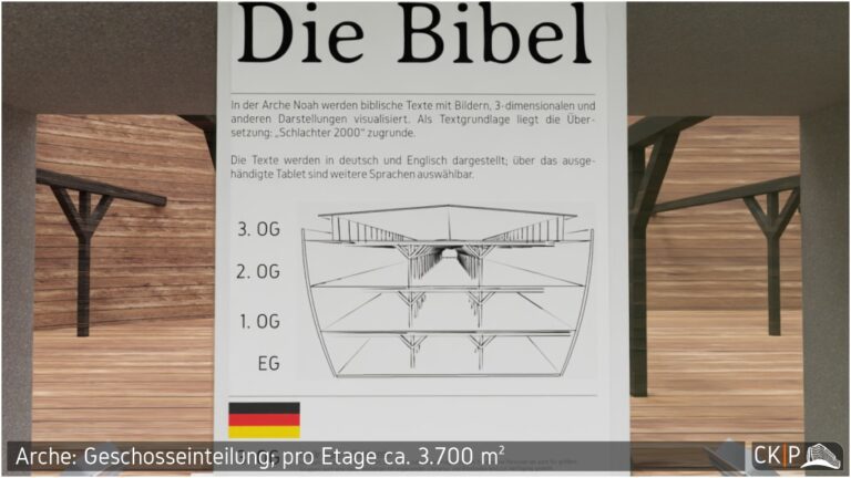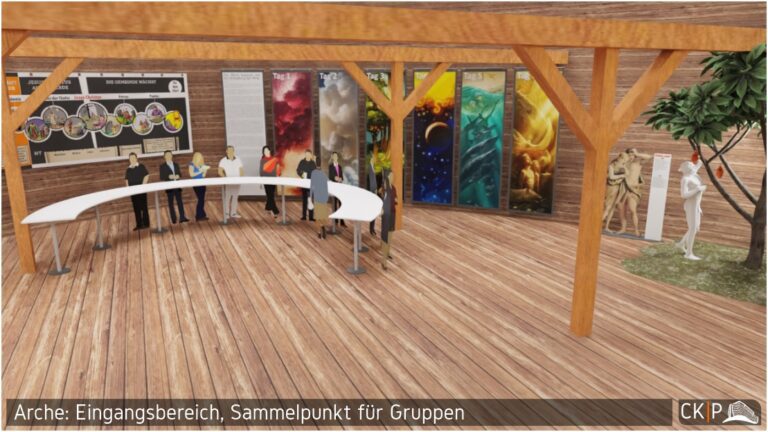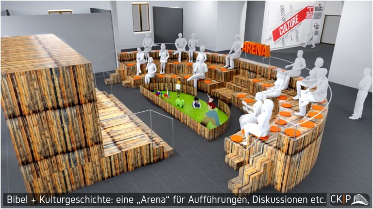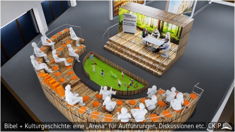Aus dieser Spannung heraus, können themenbezogene Podiumsdiskussionen organisiert werden. Die ARENA wird in den Ausstellungsbereichen Wissenschaft und Kulturgeschichte platziert. Das Bild zeigt Entwürfe, wie sich die ARENA im Ausstellungsgebäude integrieren lässt. Es ist zusätzlich angedacht, in den Räumlichkeiten einen Veranstaltungsbereich für ca. 200 Personen zu integrieren und zu vermieten, da dafür bundesweit ein hoher Bedarf christlicher Organisationen deutlich erkennbar ist.