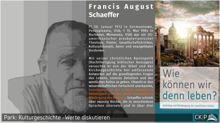 - Lt. F. A. Schaeffer gibt es einen Zusammenhang zwischen kulturellen Grundlagen, dem Frieden sowie dem Wohlstand der betreffenden Gesellschaft - und den möchten wir gerne darstellen.