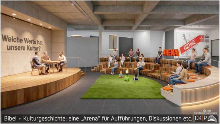 Die große Arena ist noch nicht abgebildet; die beiden Bilder zeigen aktuelle Vorschläge für den kleineren Diskussionsbereich, der im Raum der Ausstellungen Wissenschaft und Kultur mit vermutlich 20 – 30 Sitzplätzen positioniert wird. Die große Arena bietet ca. 250 Sitzplätze. Hierbei handelt es sich um eine Veranstaltungsfläche für Vorträge, Podiumsdiskussionen, Aufführungen und musikalische Darbietungen. Die ARENA stellt aber auch den Raum für Diskussionen mit kontroversen Meinungen oder Glaubensansichten zur Verfügung; sie wird im Untergeschoß positioniert werden.