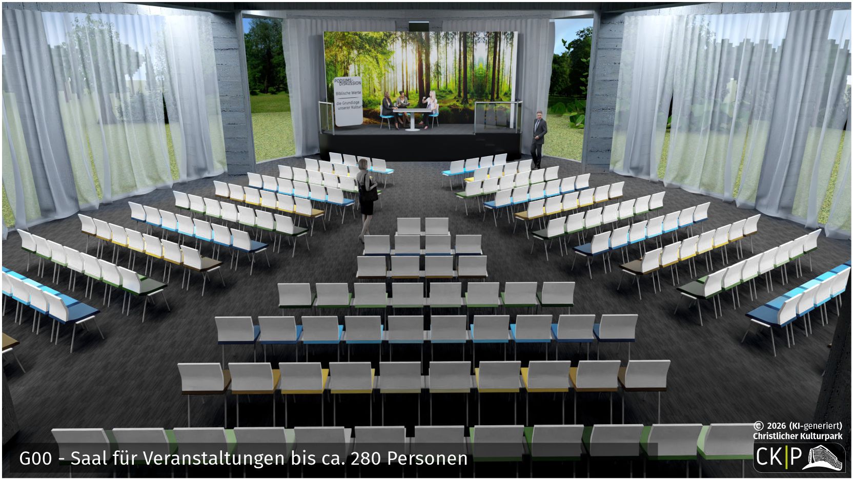 Veranstaltungssaal für ca. 250 Personen; eine Arena für kleinere Gruppen