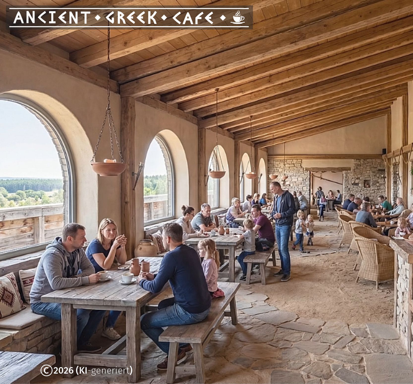 Auch für das leibliche Wohl wird gesorgt. Besucher werden in einem Hotel einchecken können. Für Ferienwohnungen und eine Gruppenunterkunft (Schulklassen) müssen die erforderlichen Baugenehmigungen zu gegebener Zeit noch beantragt werden. Momentan wird der B-Plan im Bereich des Naturschutzes aktualisiert; dieser enthält schon die Möglichkeit eines Hotelbaues. Das dargestellte ANCIENT-GREEK-CAFÉ ist für das Dachgeschoss der Arche vorgesehen.