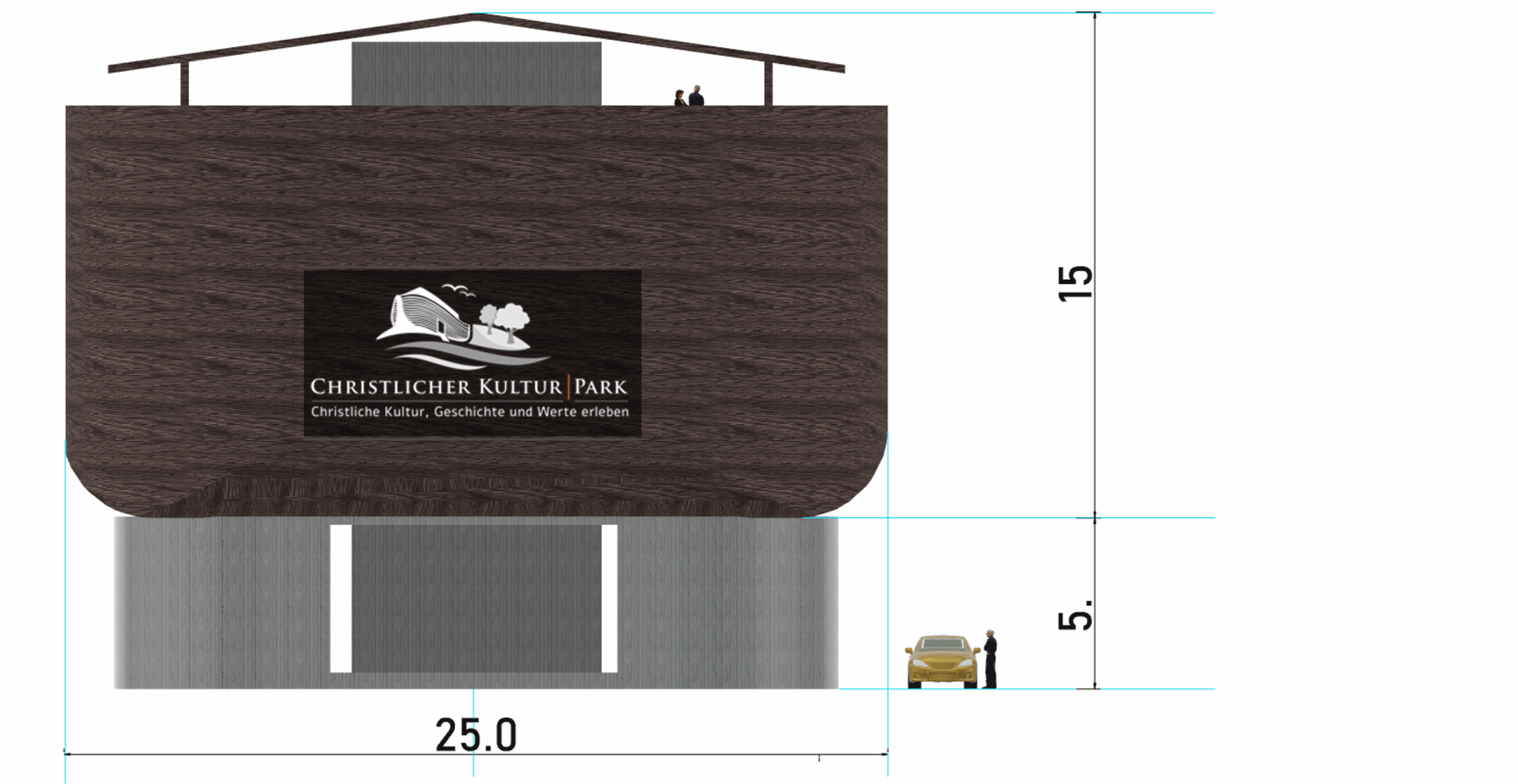 The Ark will be raised by approximately 5 meters, resulting in an additional area of approximately 3,000 square meters. This eliminates a large portion of the costs for the second exhibition building; now a small administration and entrance building is sufficient. The science and cultural exhibition will be placed in the base area of the Ark.